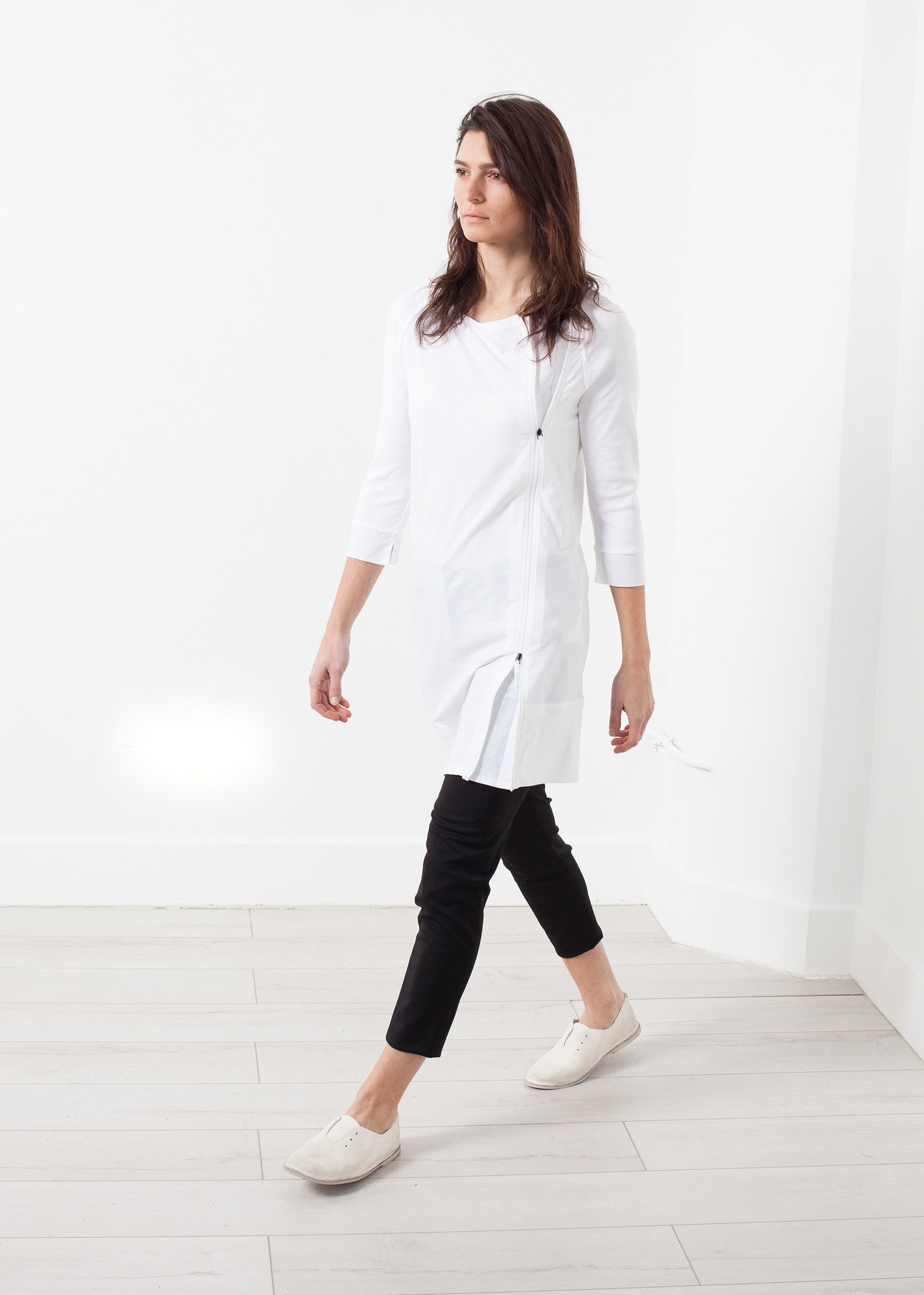 The Berry by Annette Gortz is part tunic, part knit top. 3/4 inch sleeves. Boat neckline. Side double zip at left front. Color Off-White. 92% Cotton, 8% Spandex, Trim 100% Cotton. Made in Germany. Lana is wearing a Small. Lana is 5'7, hips 36.5", waist 25", bust 34.5".